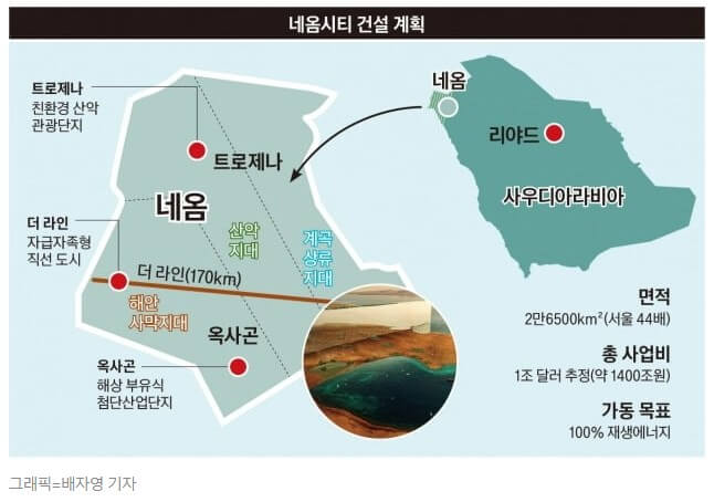 네옴시티는 사우디아라비아 정부가 비전2030 정책의 일환으로 발표한 신도시 계획입니다. 약 1조 달러를 투자해 서울의 44배에 달하는 크기인 2만 6500㎢ 면적의 친환경 신도시를 건설하겠다는 것입니다.